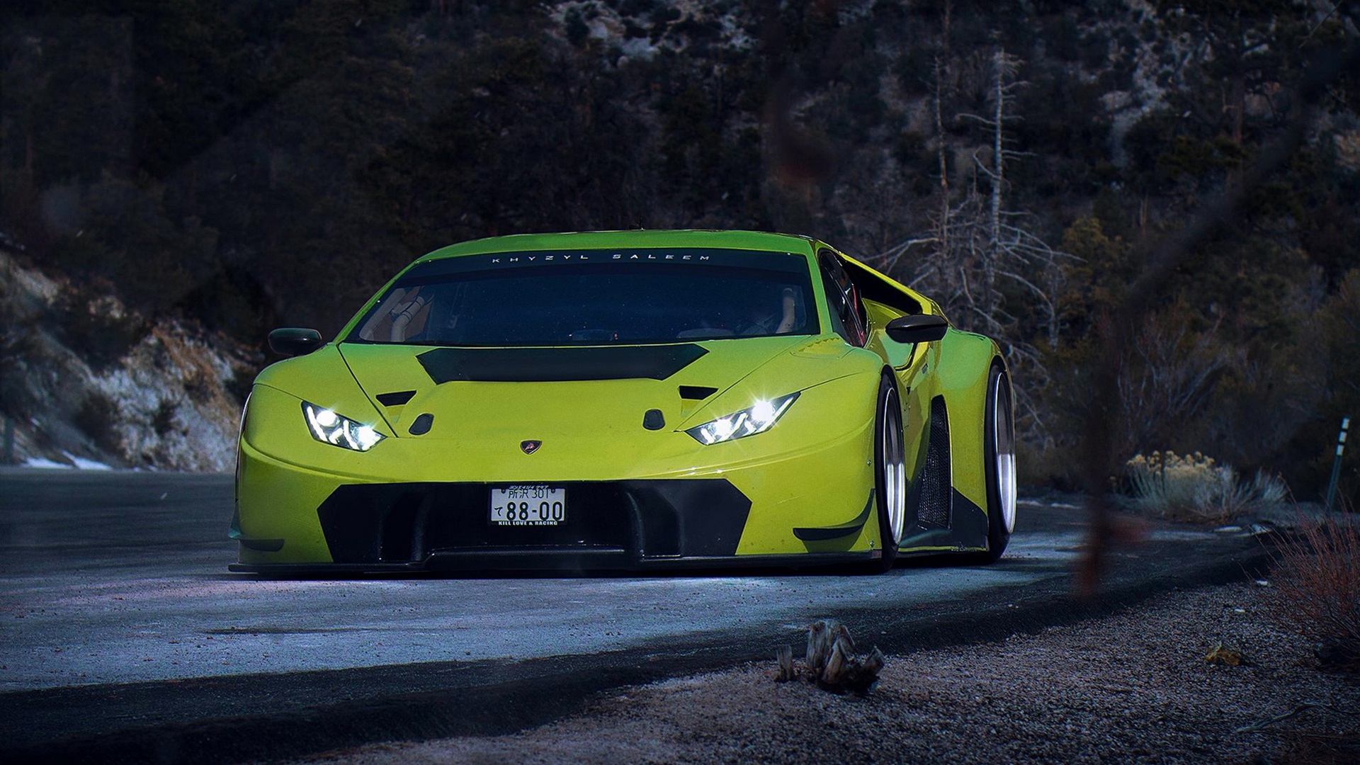 Description: A yellow sports car driving down a road at night time with its door open and lights on.