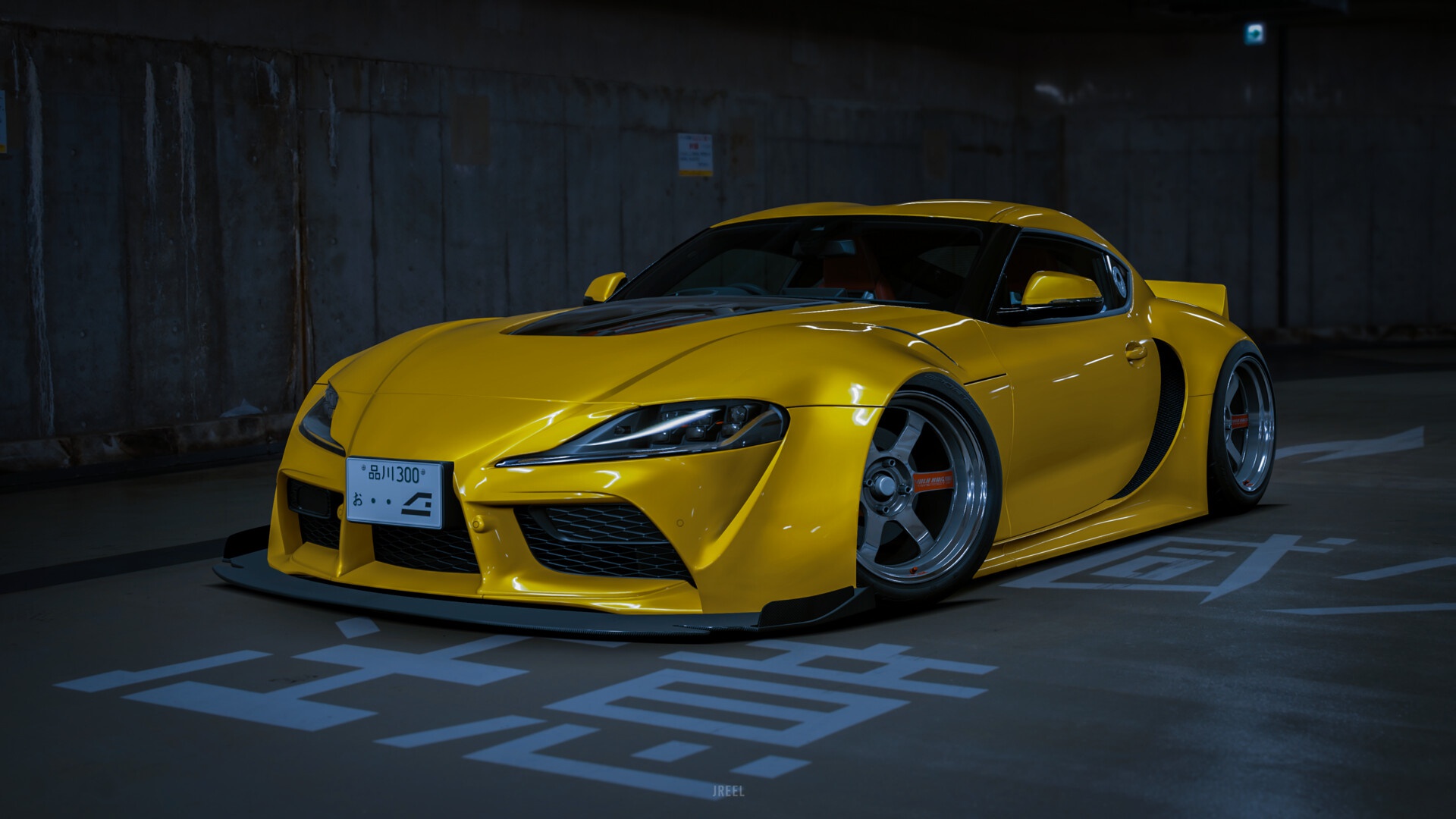 Description: A yellow sports car parked in a parking lot at night time with a license plate on the front of it.