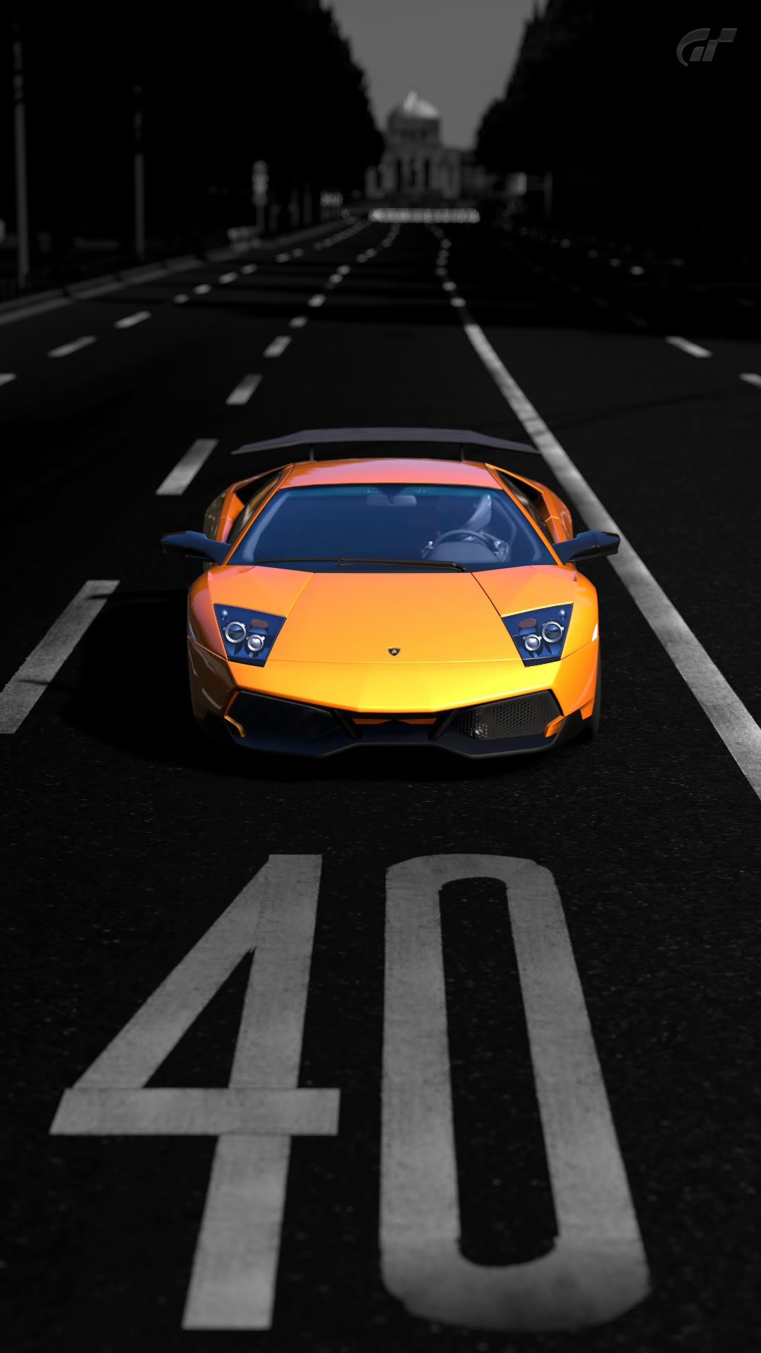 Description: A yellow sports car driving down a street next to a number forty sign in the dark of night with a black background.