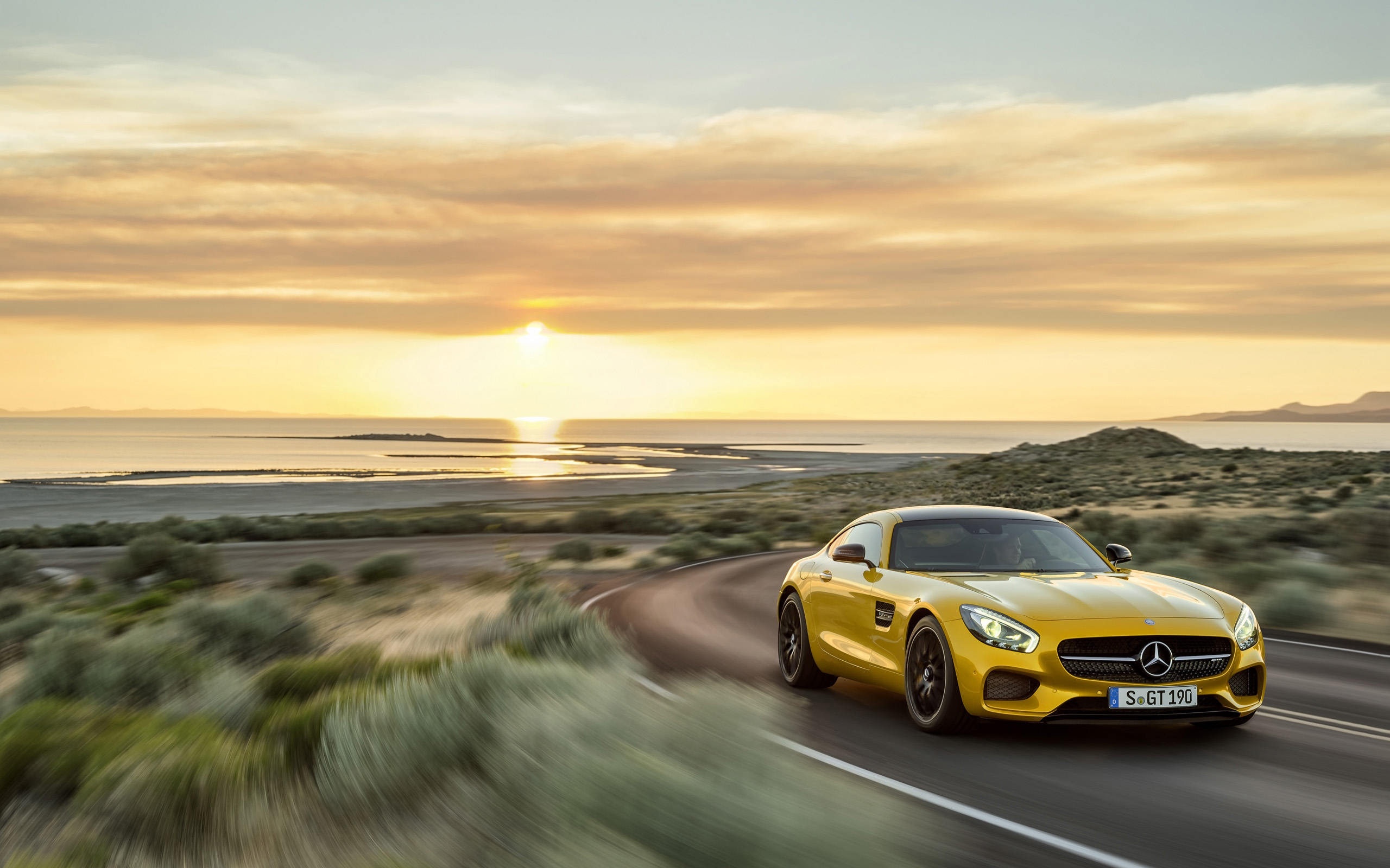 Description: A yellow sports car driving down a road near the ocean at sunset or sunrise or sunset time with the sun setting.