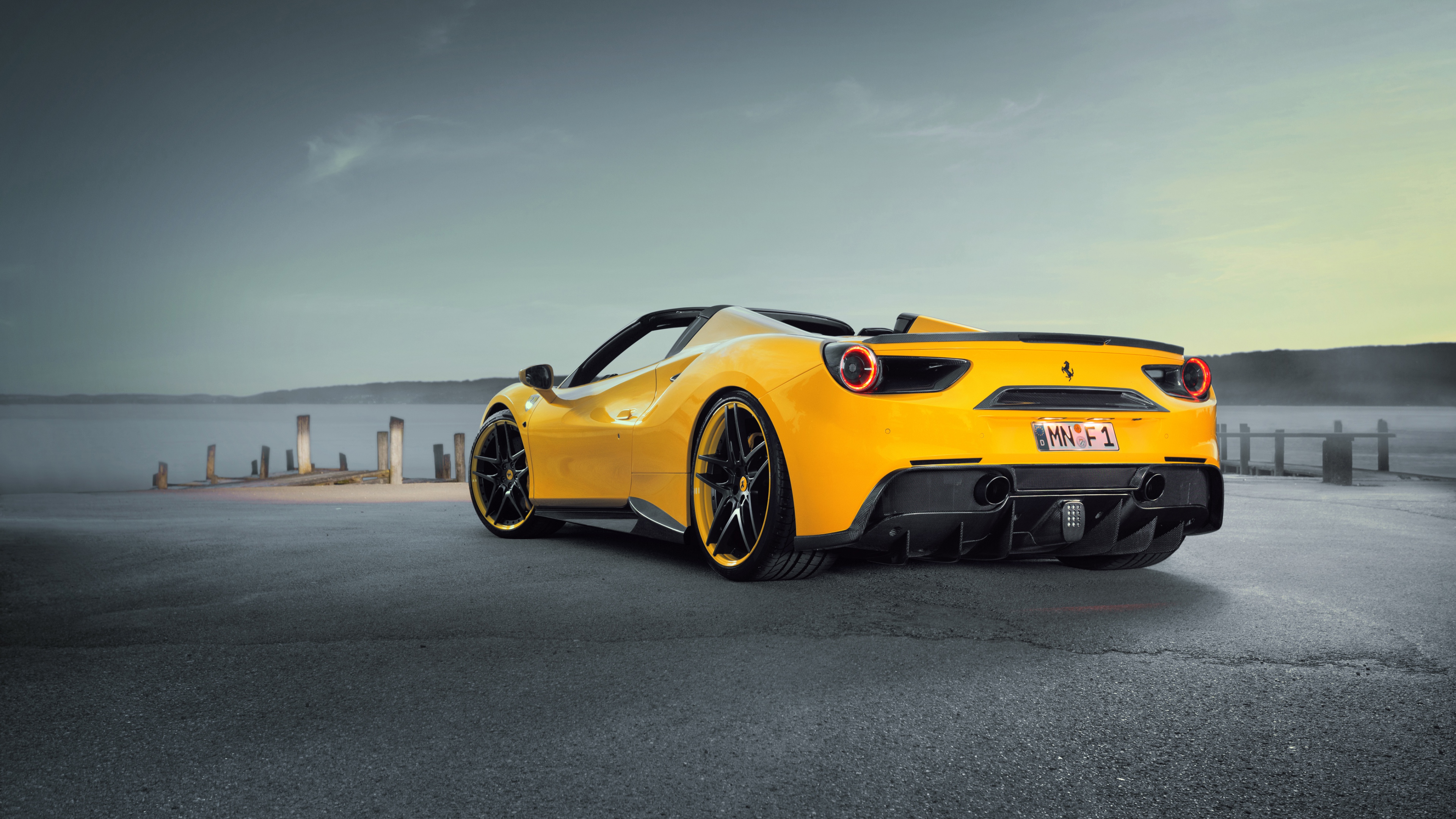 Description: A yellow sports car parked on a parking lot next to a body of water with a cloudy sky in the background.