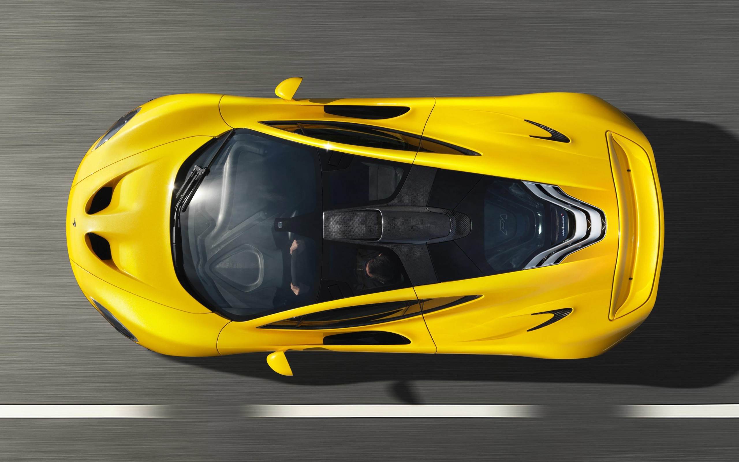 Description: A yellow sports car is seen from above on a road with a gray background and a black stripe on the side.