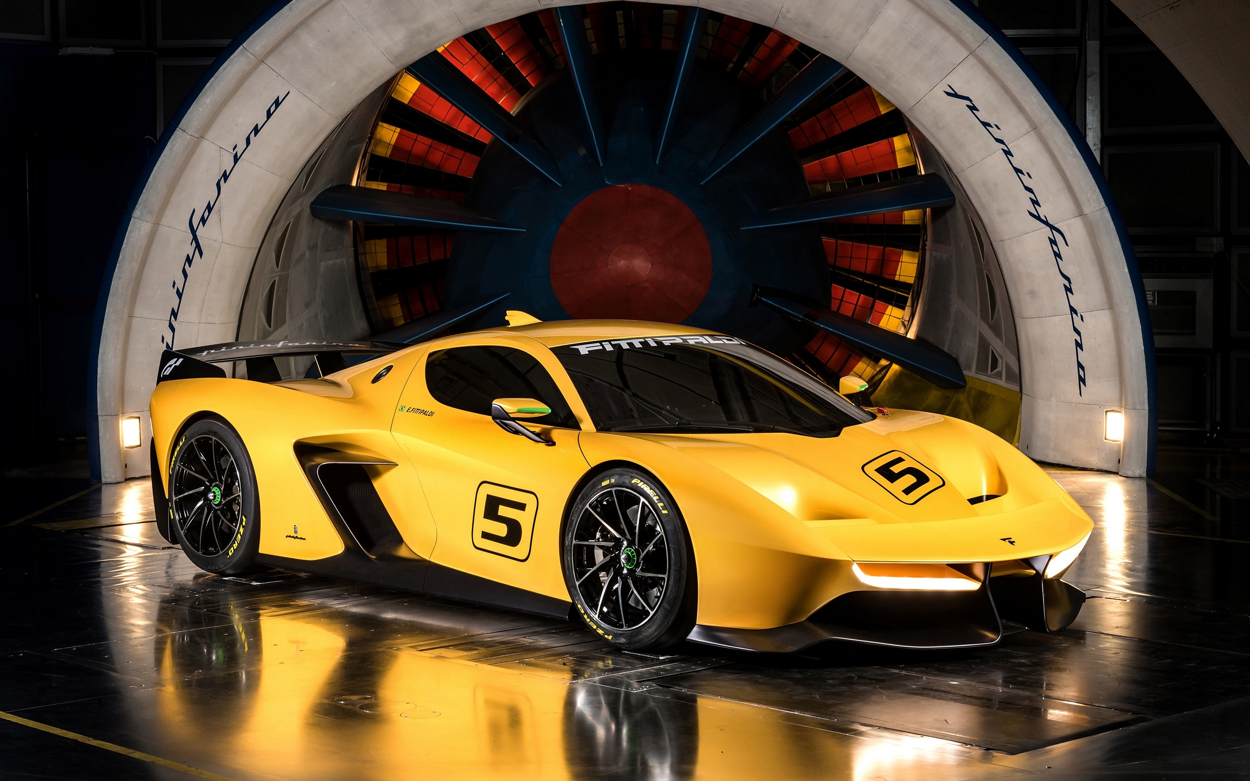 Description: A yellow sports car is parked in a tunnel with a wheel in the background and a circular object in the background.