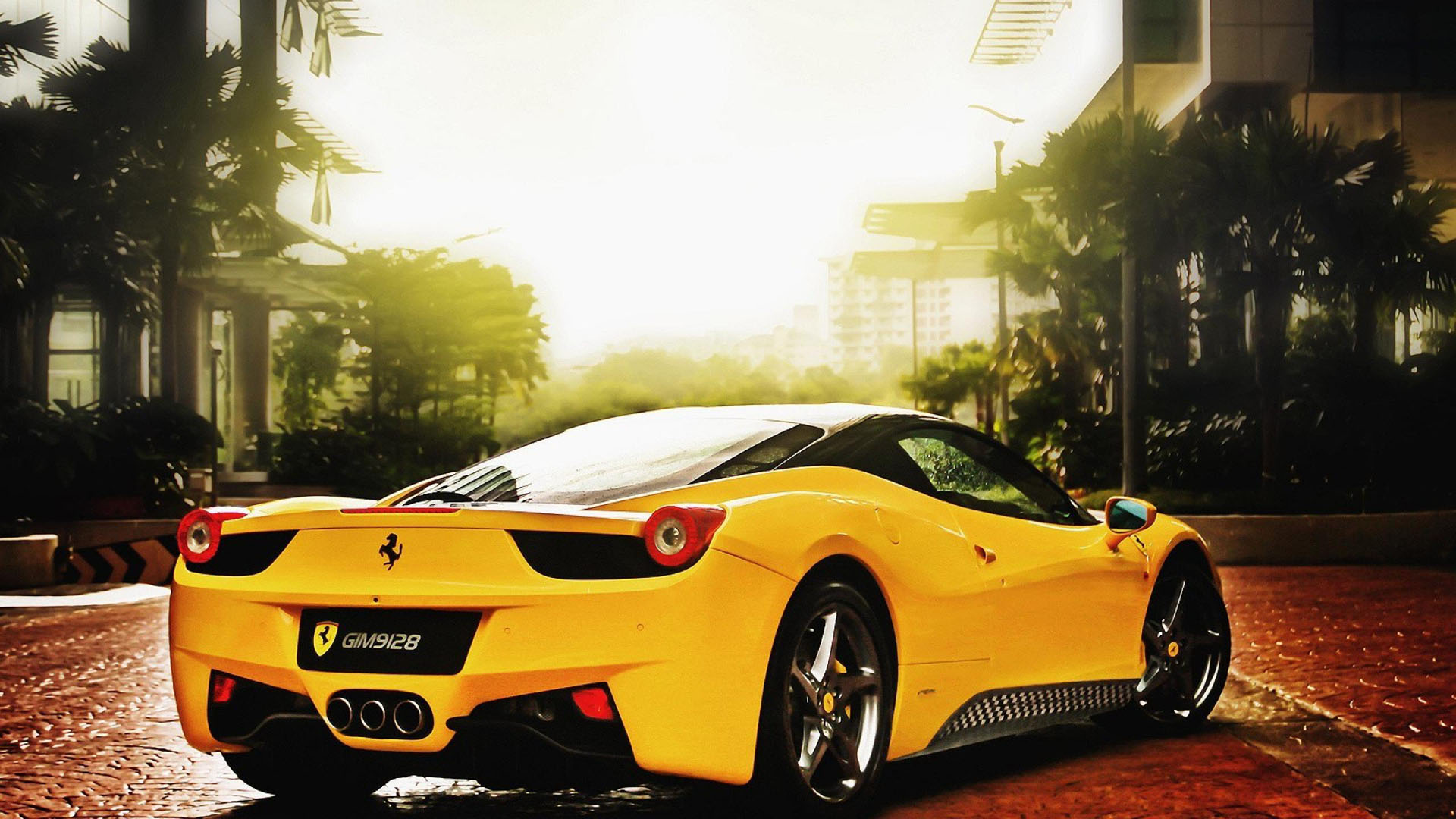 Description: A yellow sports car parked on a wet street in front of a building with palm trees and a sun flare.