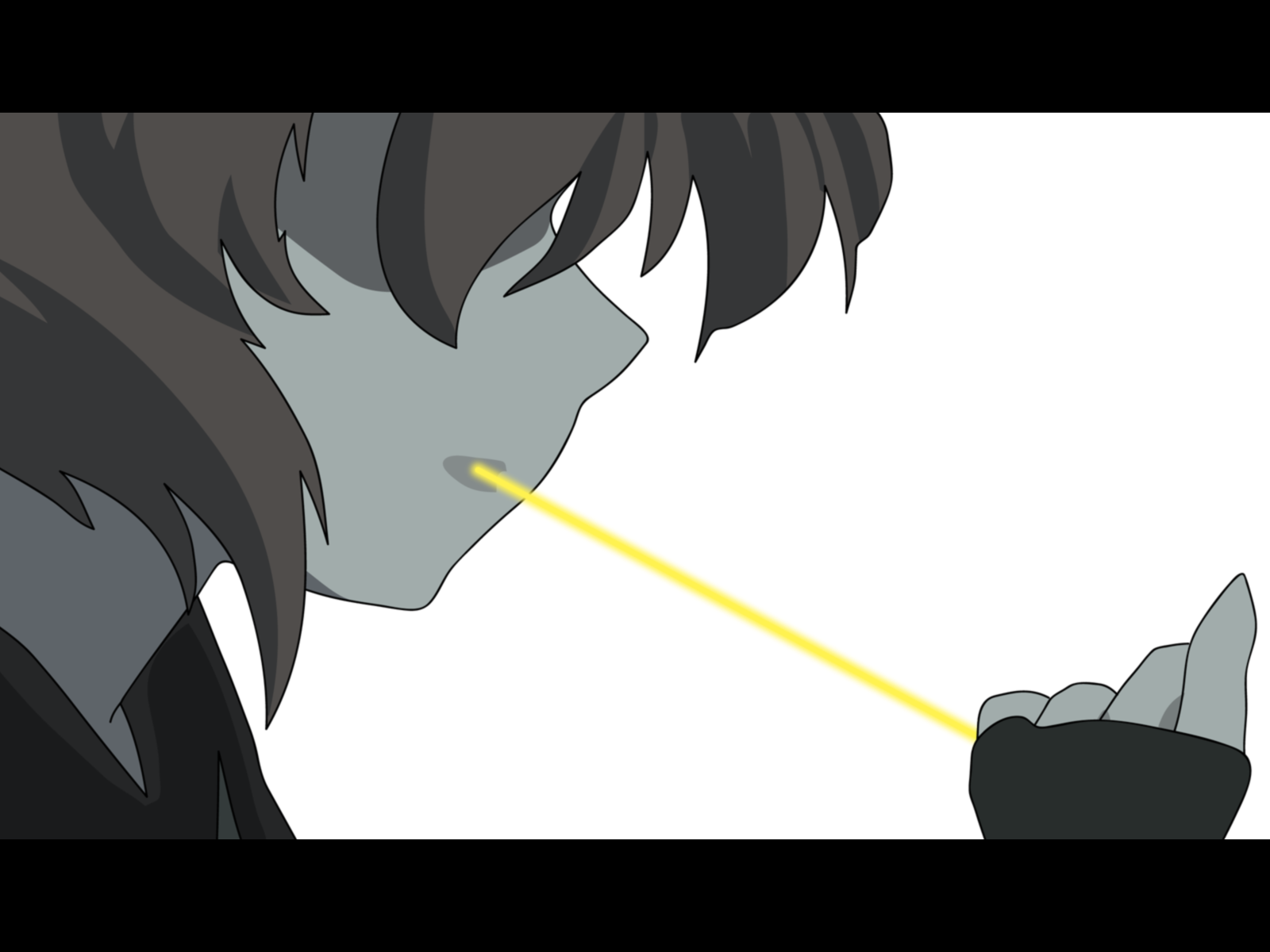 Description: A person with a yellow stick in their mouth looking at something in the distance with a black background and a white background.