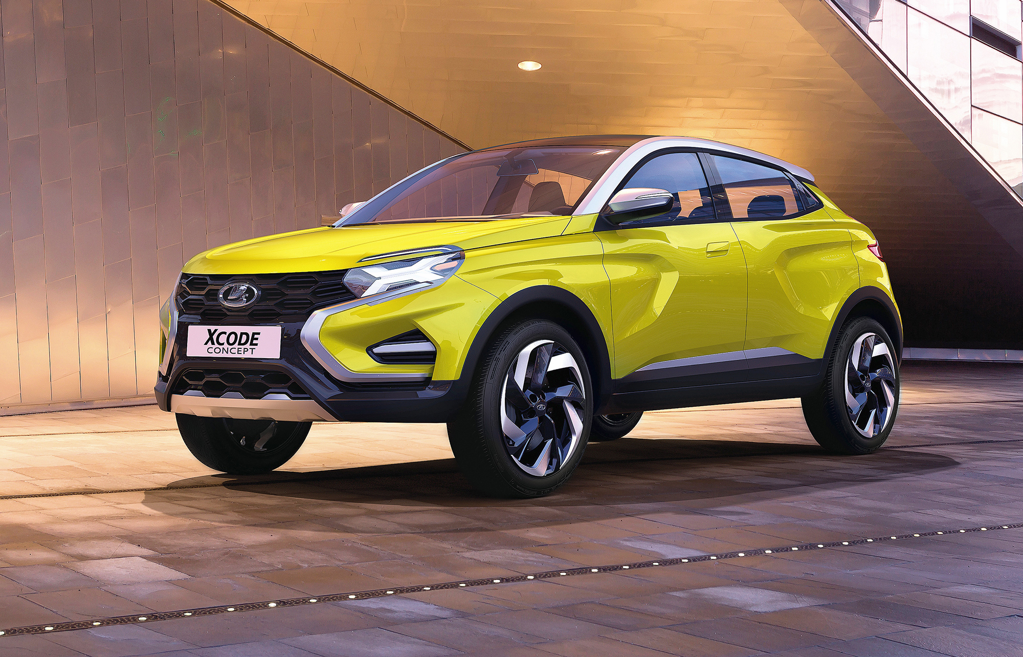 Description: A yellow suv parked in front of a building with a light on it's side and a black car behind it.