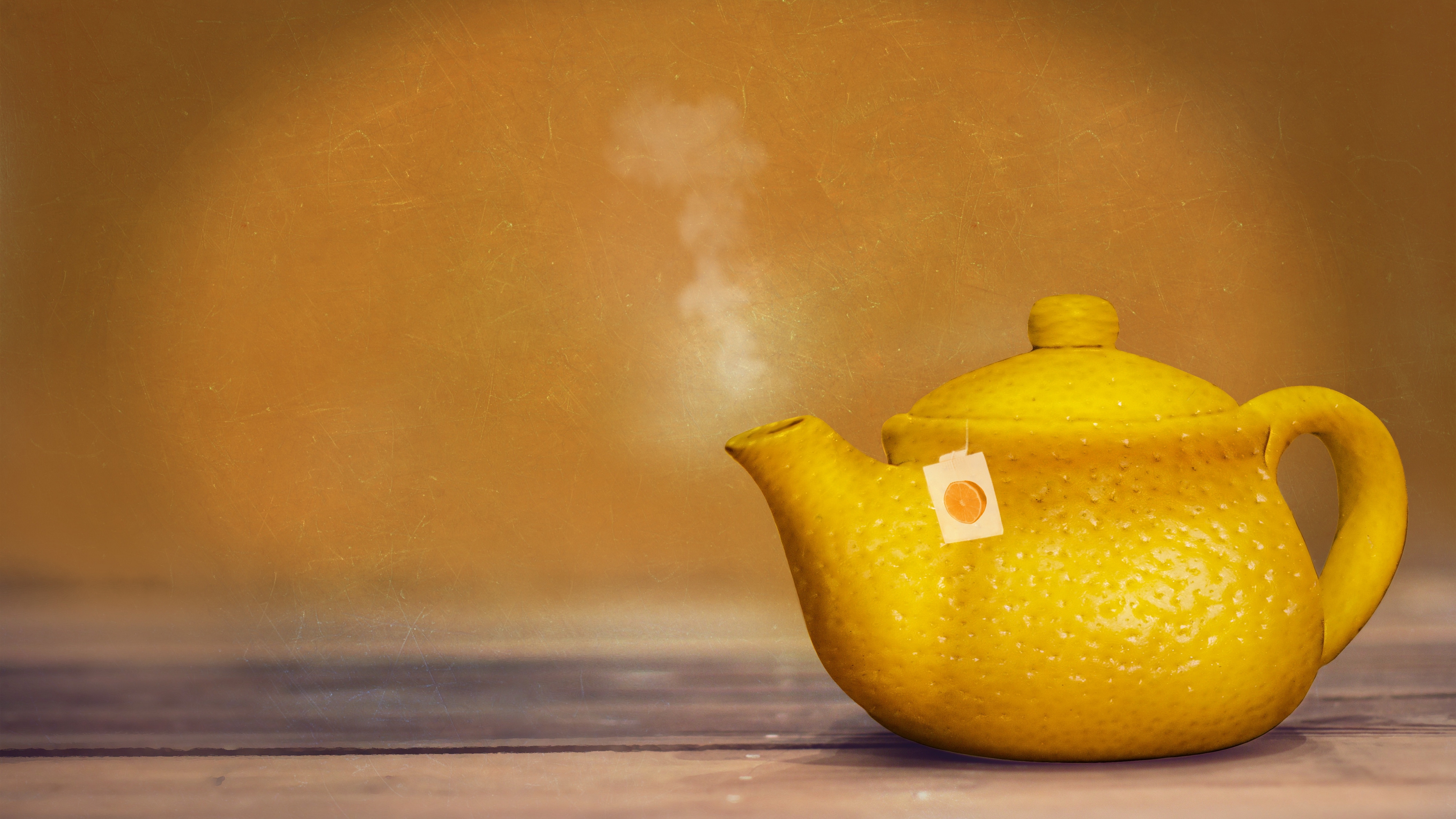 Description: A yellow teapot with a tag on it sitting on a table next to a wall and a wooden floor.