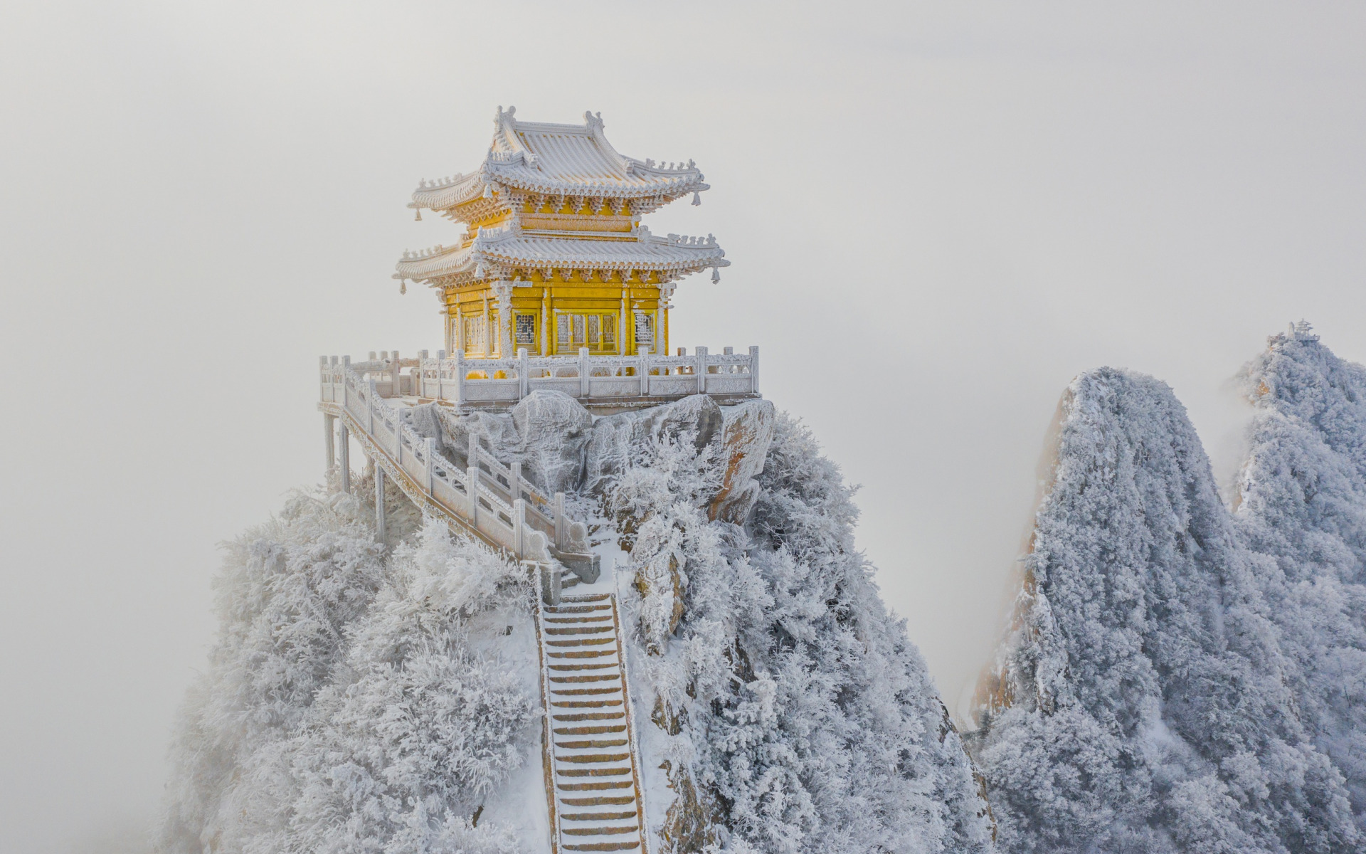 Description: A yellow tower on top of a snowy mountain with a ladder leading up to it's top and a yellow door.
