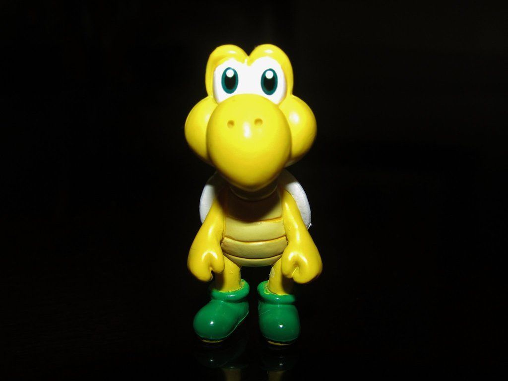 Description: A yellow toy with a green rubber boot on a black surface with a black background and a black background.