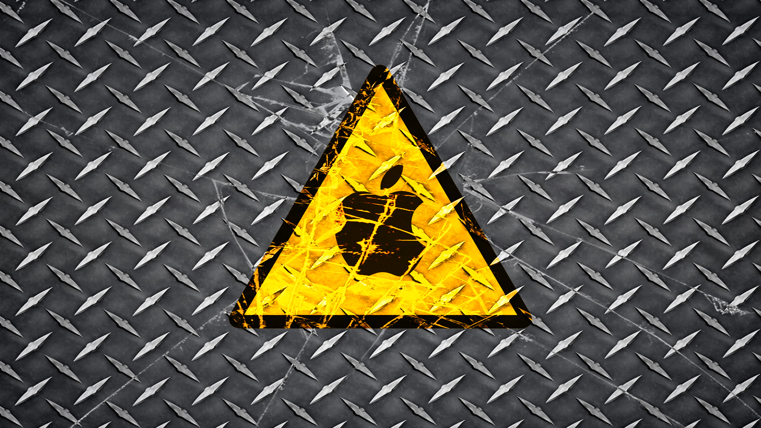 Description: A yellow triangle with a fist on it on a metal background with rivets and scratches in it.