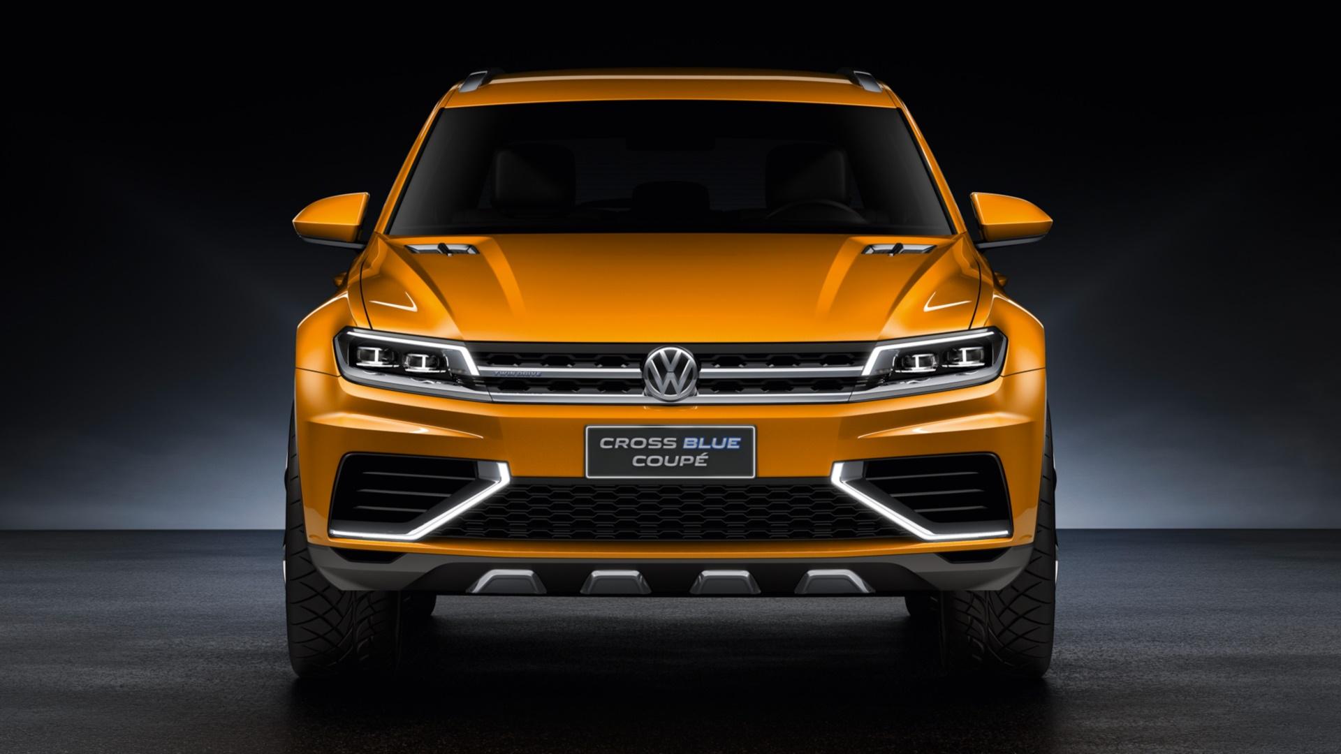 Description: A yellow volkswagen suv is shown in a dark room with a black background and a black floor and a black wall.