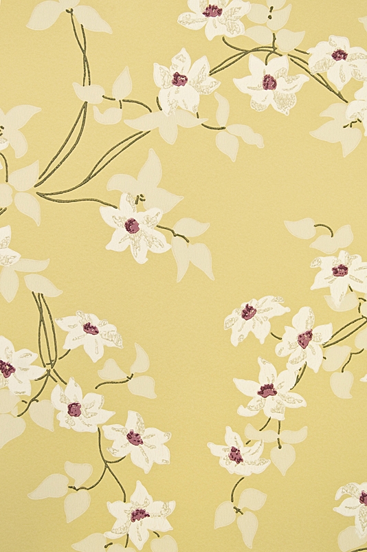 Description: A yellow wall with a flower pattern on it and a clock on the wall next to it and a clock on the wall.