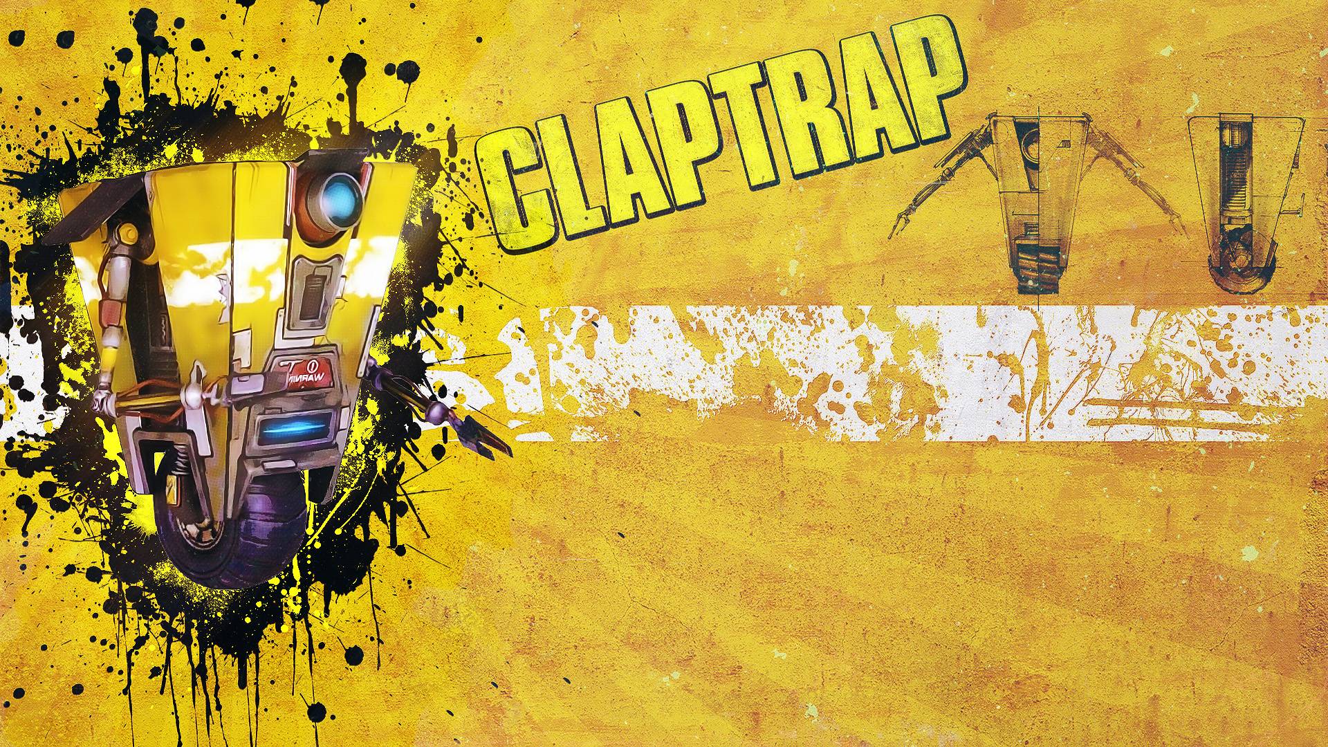 Description: A yellow wall with a picture of a robot on it and the words claptrap painted on it.