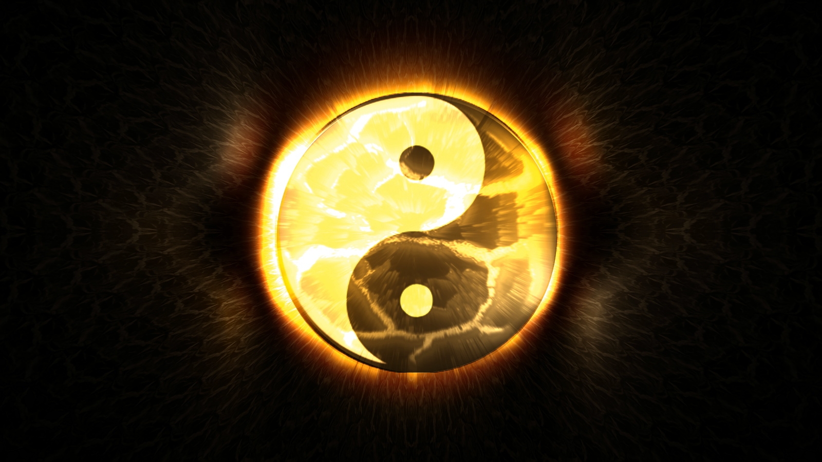 Description: A yellow and black yin - yang symbol in a dark background with a lightening effect of fire and smoke.