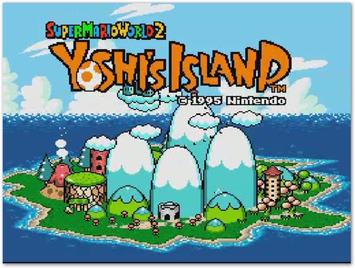 Description: A game cover for yoshi island with a cartoon island in the background and a sky background with clouds.