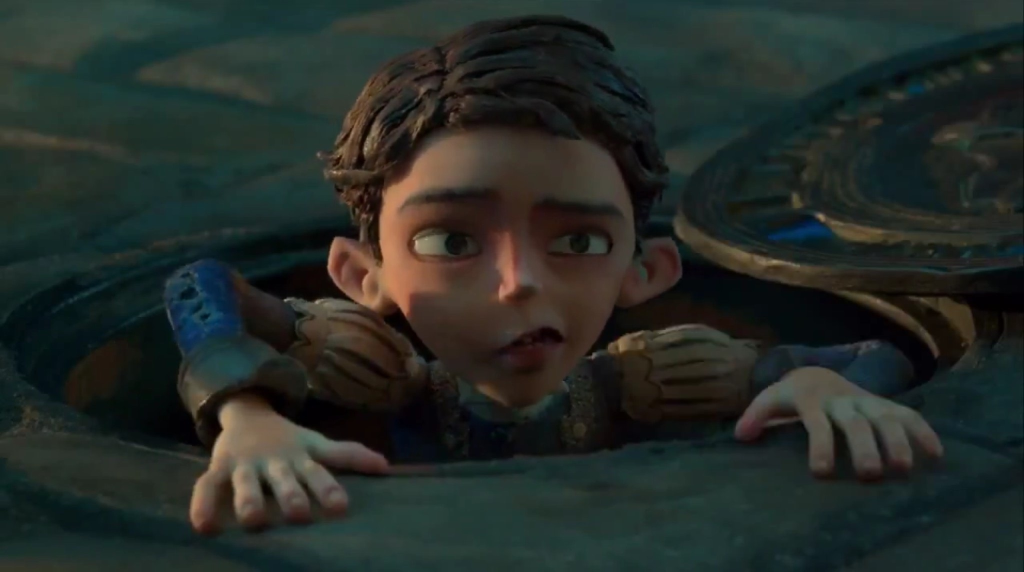Description: A young boy with his hands on his face looking out from behind a hole in the ground with his hands on his face.