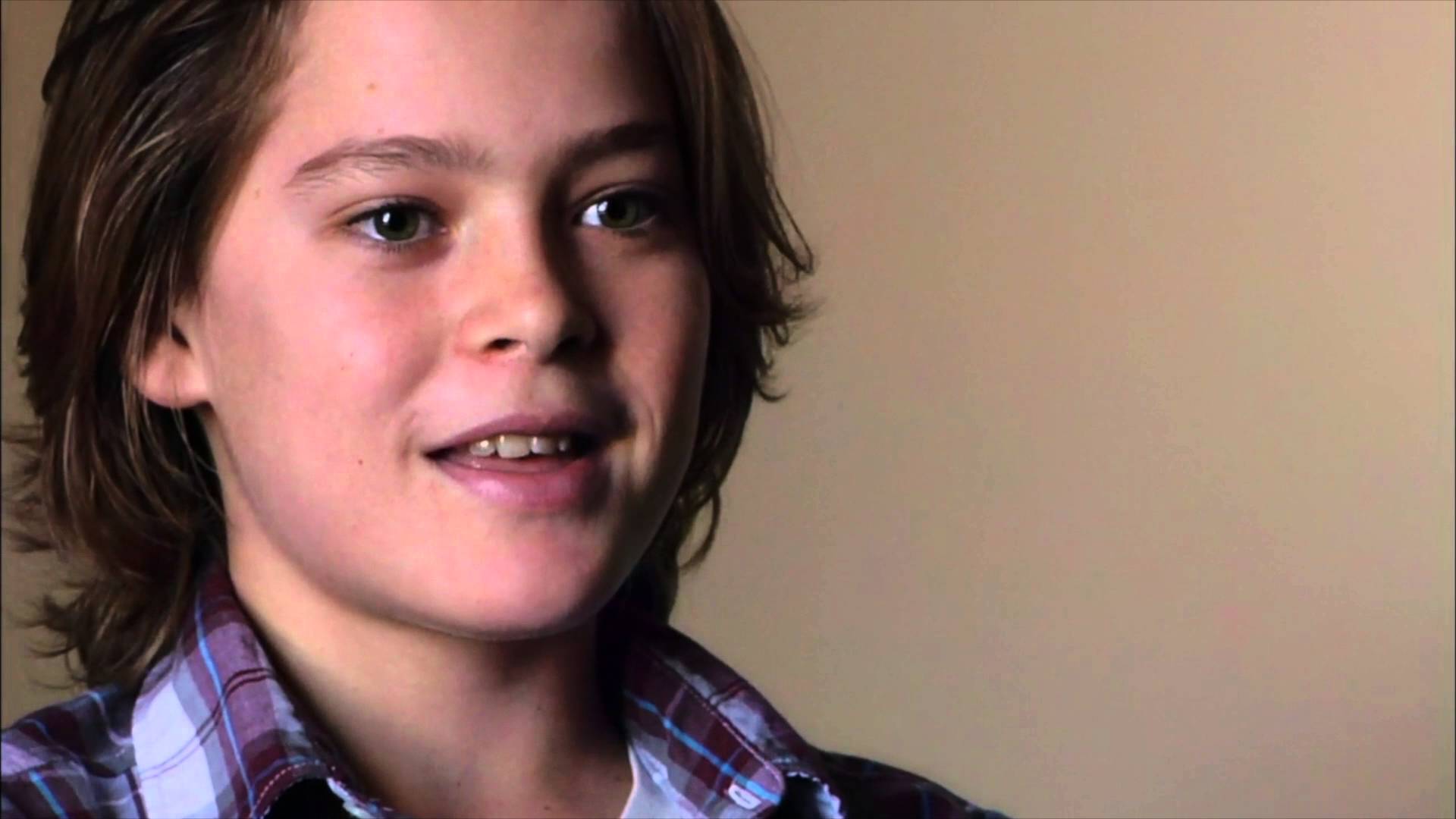 Description: A young boy with a plaid shirt and a tie on smiling at the camera with a serious look on his face.
