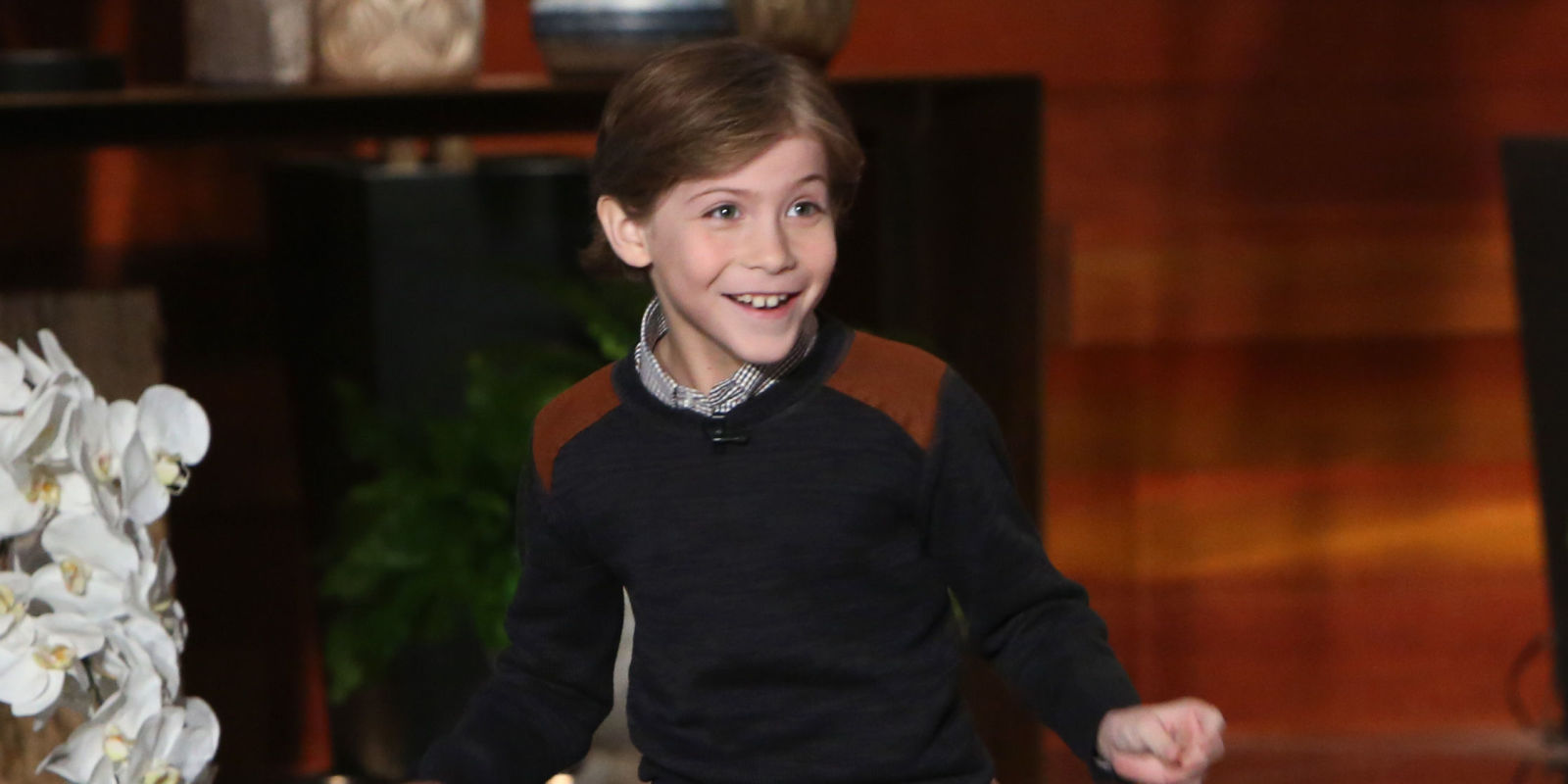 Description: A young boy is smiling and standing in front of a flower arrangement on a television set with a vase of flowers in the background.