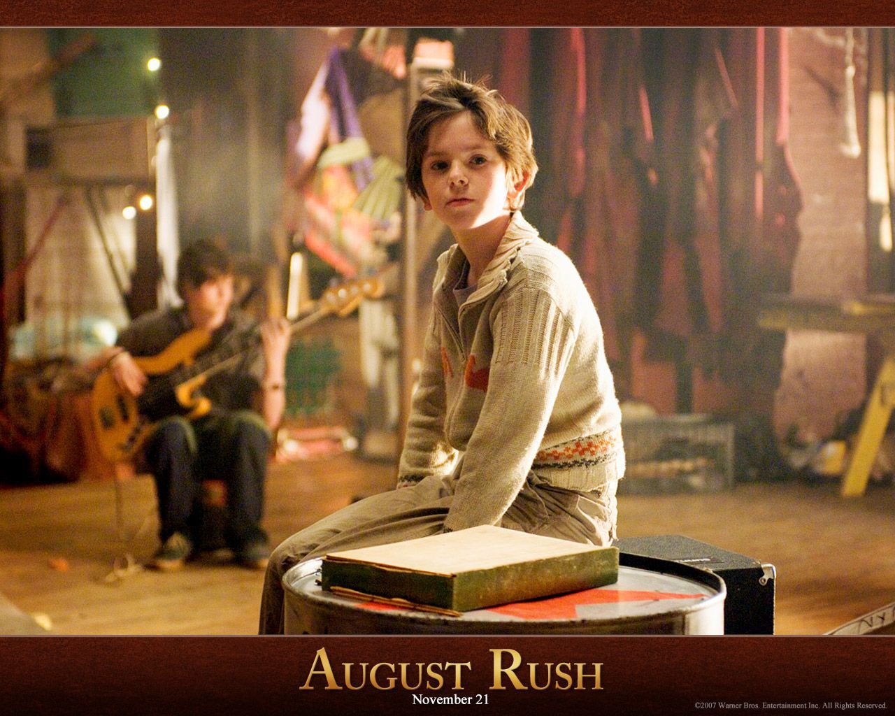 Description: A young boy sitting on a stool in a room with other people playing instruments and a guitar in the background.