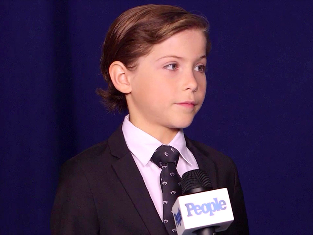 Description: A young boy in a suit and tie holding a microphone and wearing a tie with people on it on it.