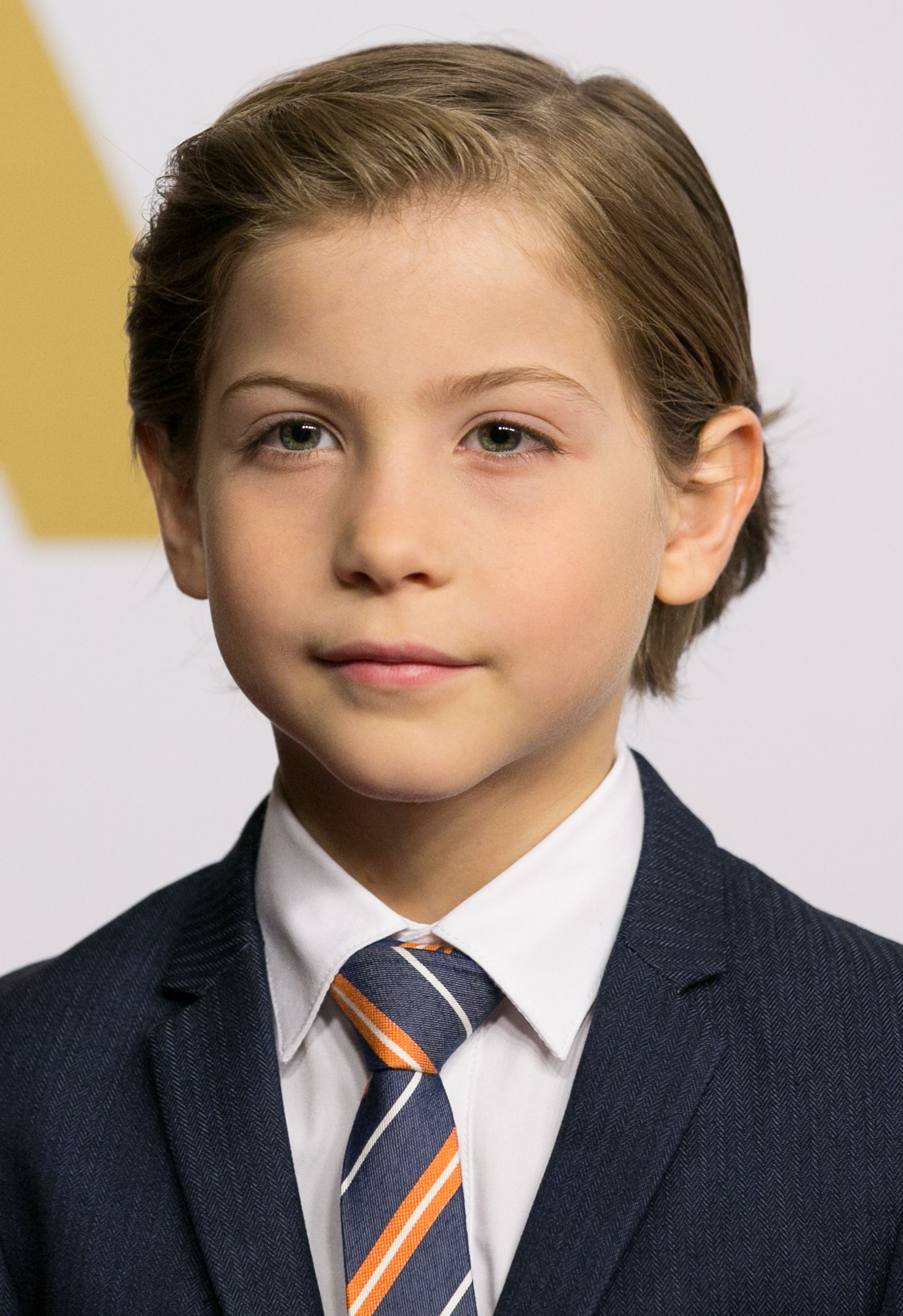 Description: A young boy wearing a suit and tie with a serious look on his face and shoulders.