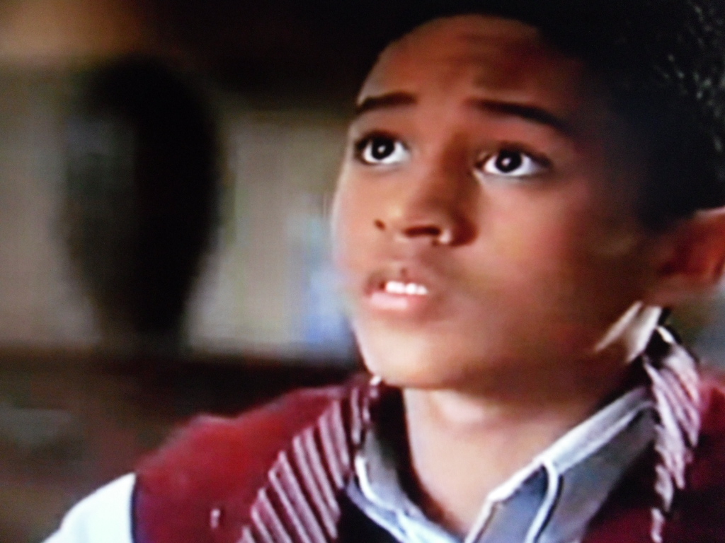 Description: A young boy with a vest and tie looking up at something in the distance with a serious look on his face.