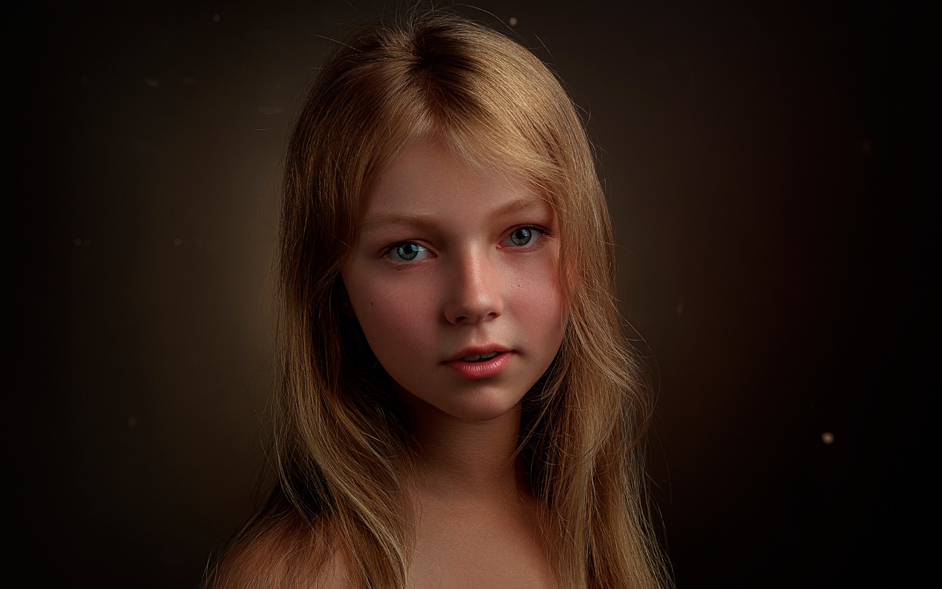 Description: A young girl with long blonde hair and blue eyes is posing for a picture in a dark room with a black background.