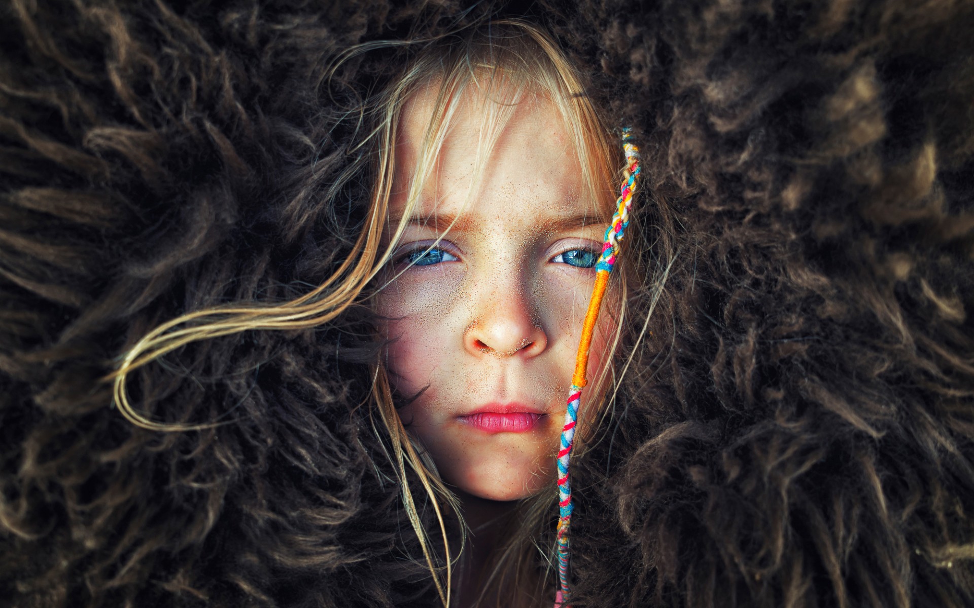 Description: A young girl with blue eyes and a long hair is peeking out from a fur coat with a beaded headband.