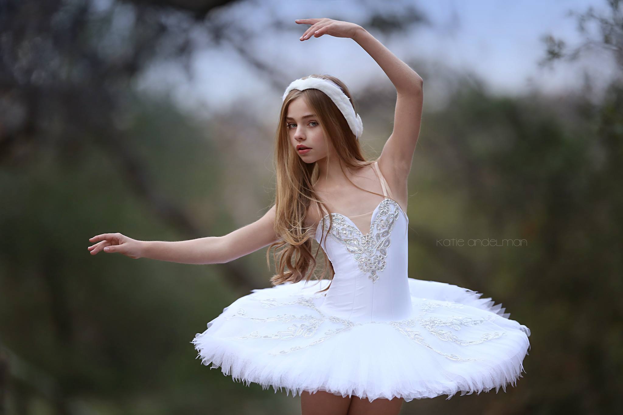 Description: A young girl dressed in a white tutu and headband is posing for a picture in a white tutu.