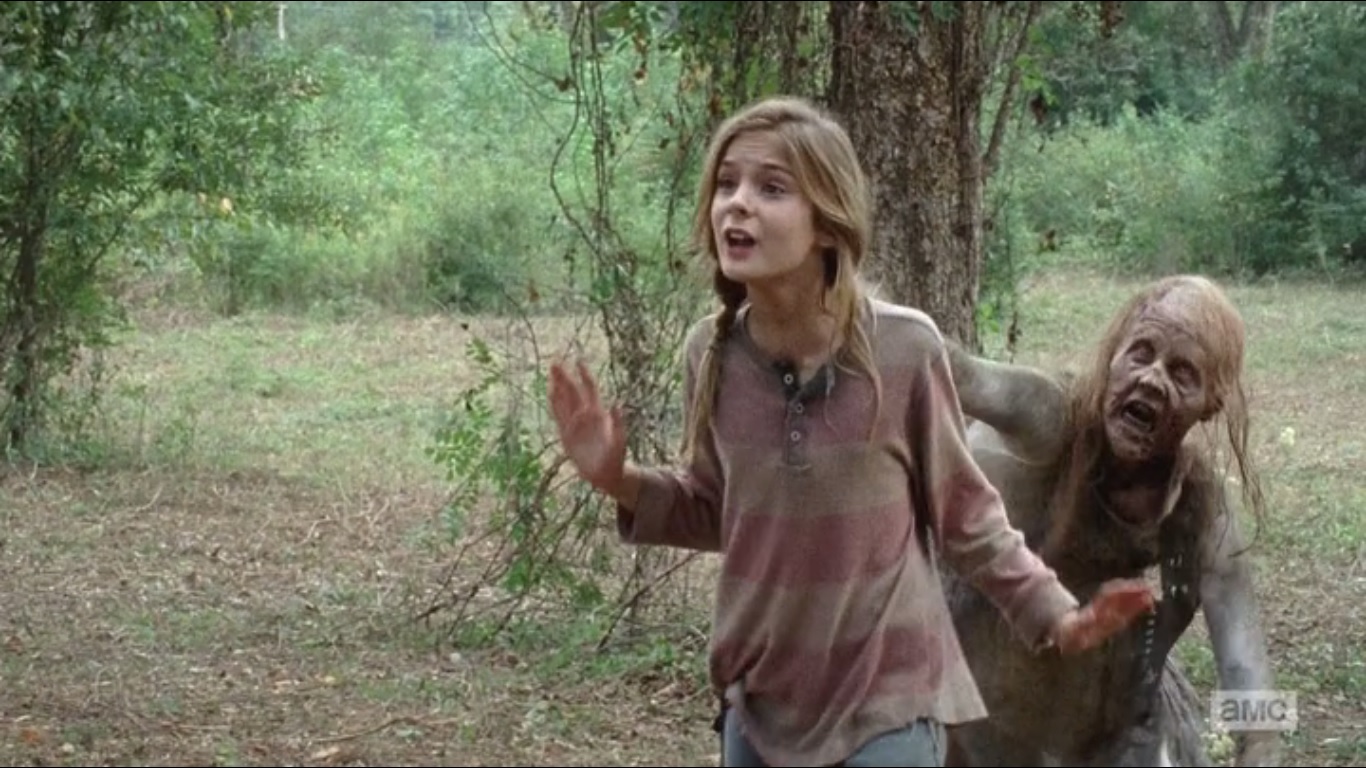 Description: A young girl is walking through the woods with a zombie face on her face and a man in the background.