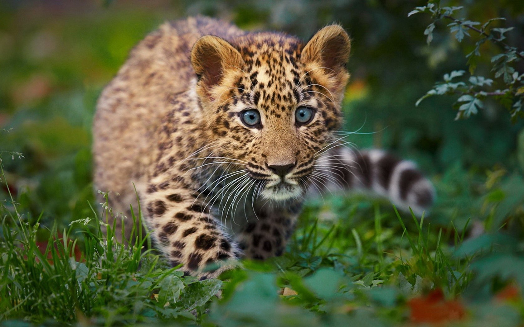 Description: A young leopard walking through a lush green forest filled with leaves and flowers.