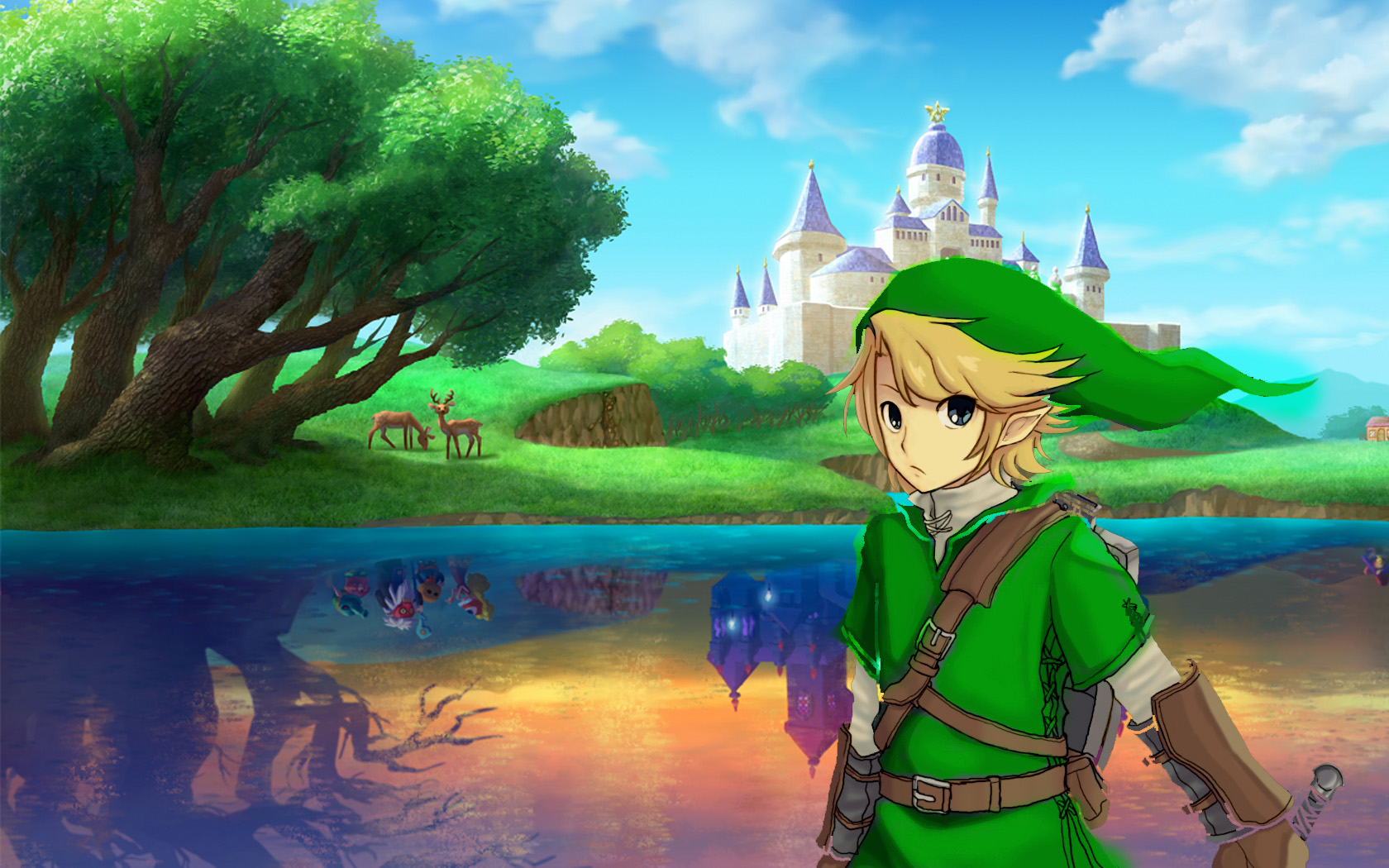 Description: A young link link standing in front of a lake with a castle in the background and a forest in the foreground.