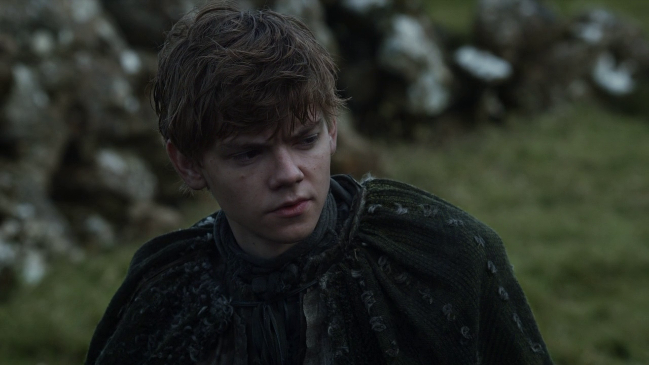 Description: A young man in a black outfit standing in a field with a rock formation behind him and a green grass area behind him.