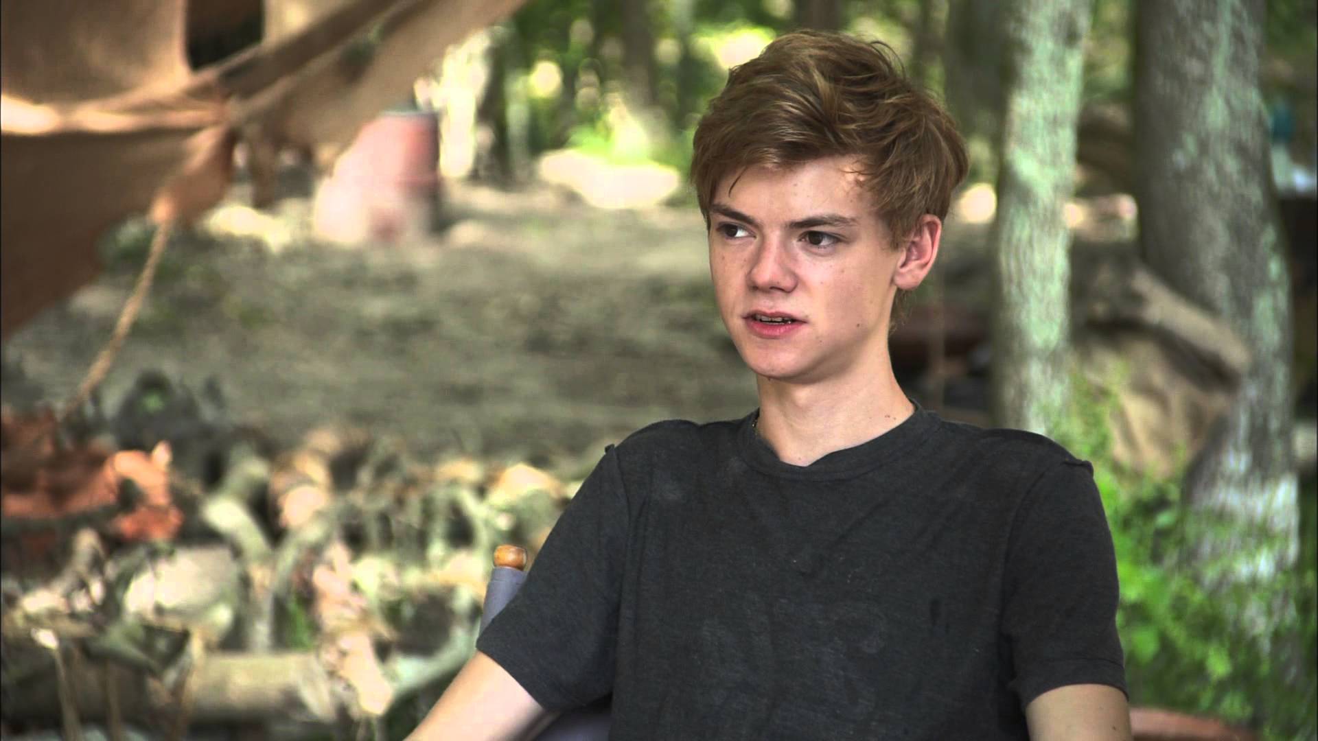 Description: A young man sitting in a chair in a forest with a blurry background of trees and a building.