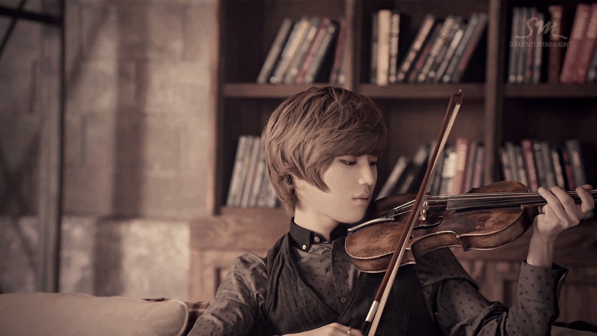Description: A young man playing a violin in a library with bookshelves behind him and a bookcase behind him.