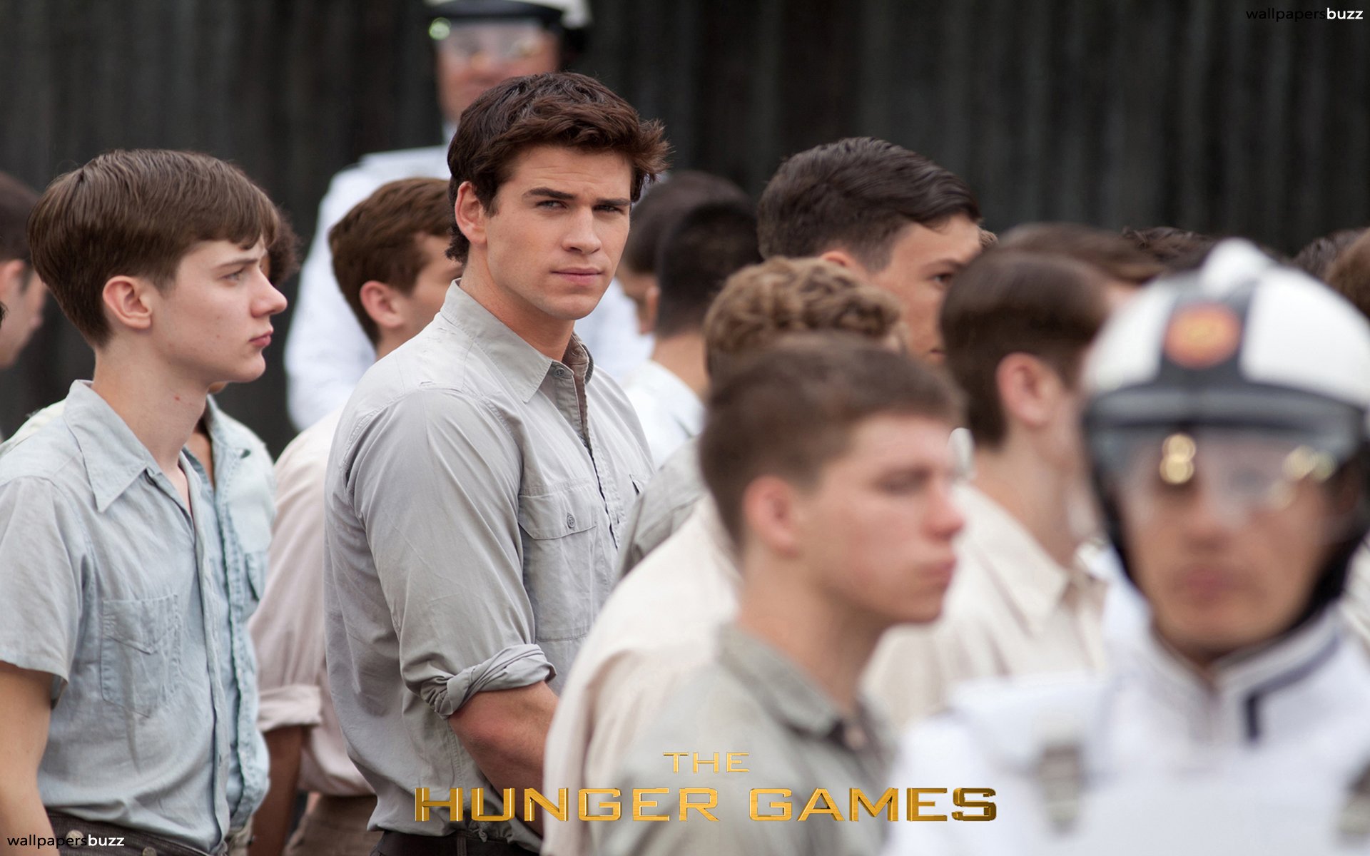 Description: A group of young men standing next to each other in front of a crowd of people wearing uniforms and helmets.
