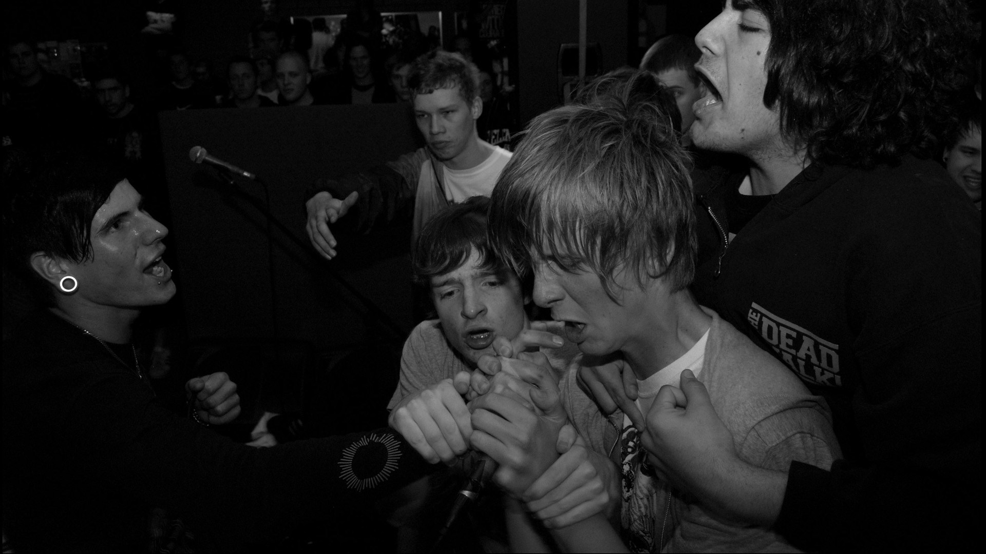 Description: A group of young men standing around each other eating food from their mouths and hands together in a crowded room.