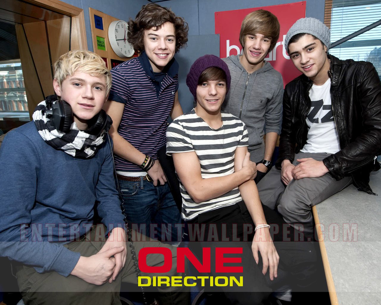 Description: A group of young men posing for a picture together in a room with a one direction sign on the wall.