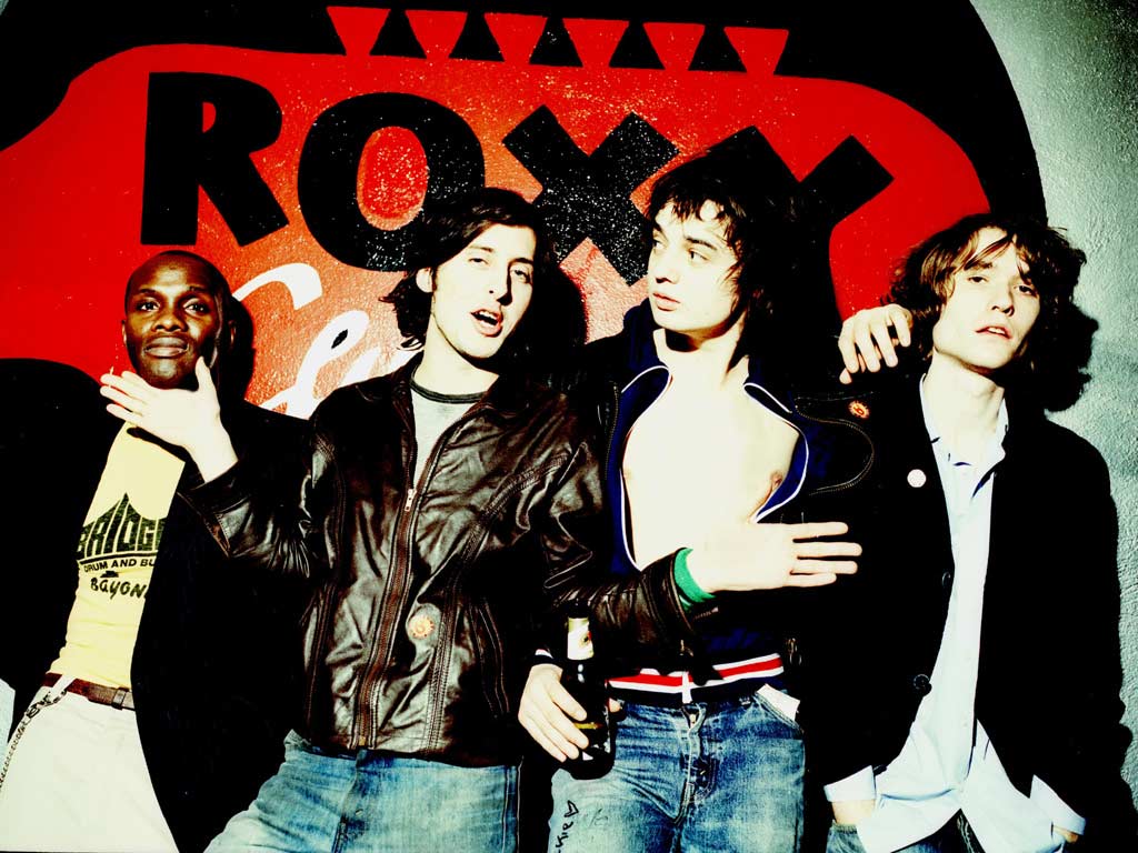 Description: A group of young men standing next to each other in front of a sign that says roxy on it.