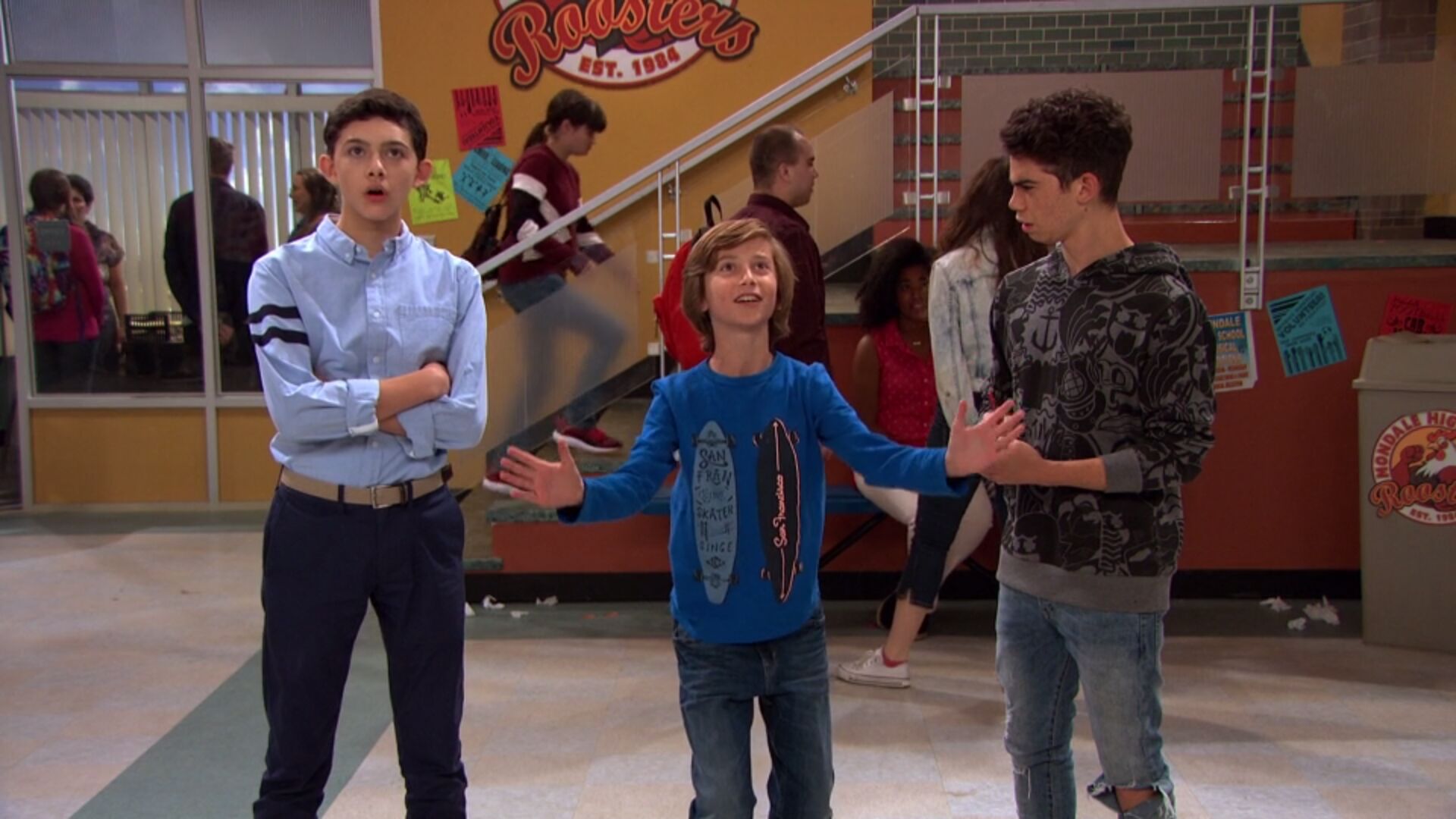 Description: A group of young men standing next to each other on a floor in a room with a staircase and a staircase case.