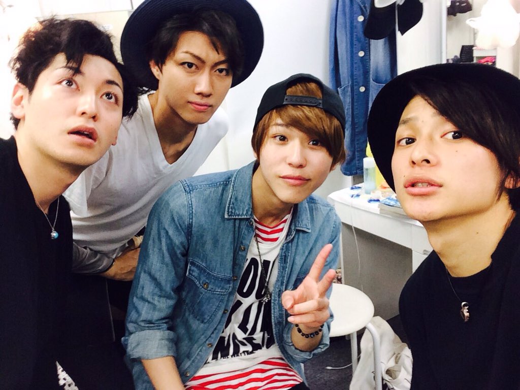 Description: A group of young men sitting next to each other in a room with a mirror and a table with a laptop on it.