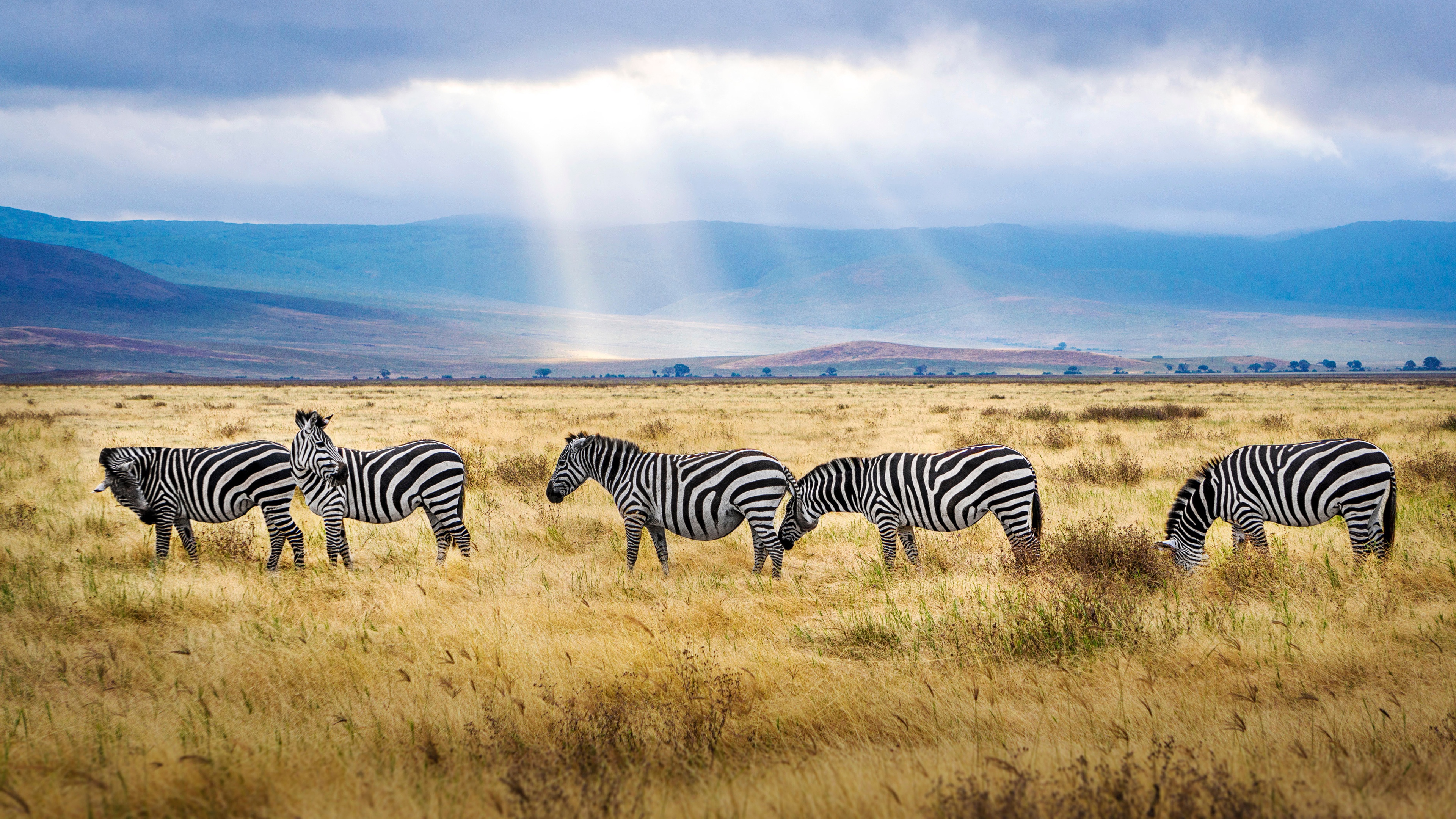 Description: A herd of zebras grazing in a field with mountains in the background and sunbeams in the sky.