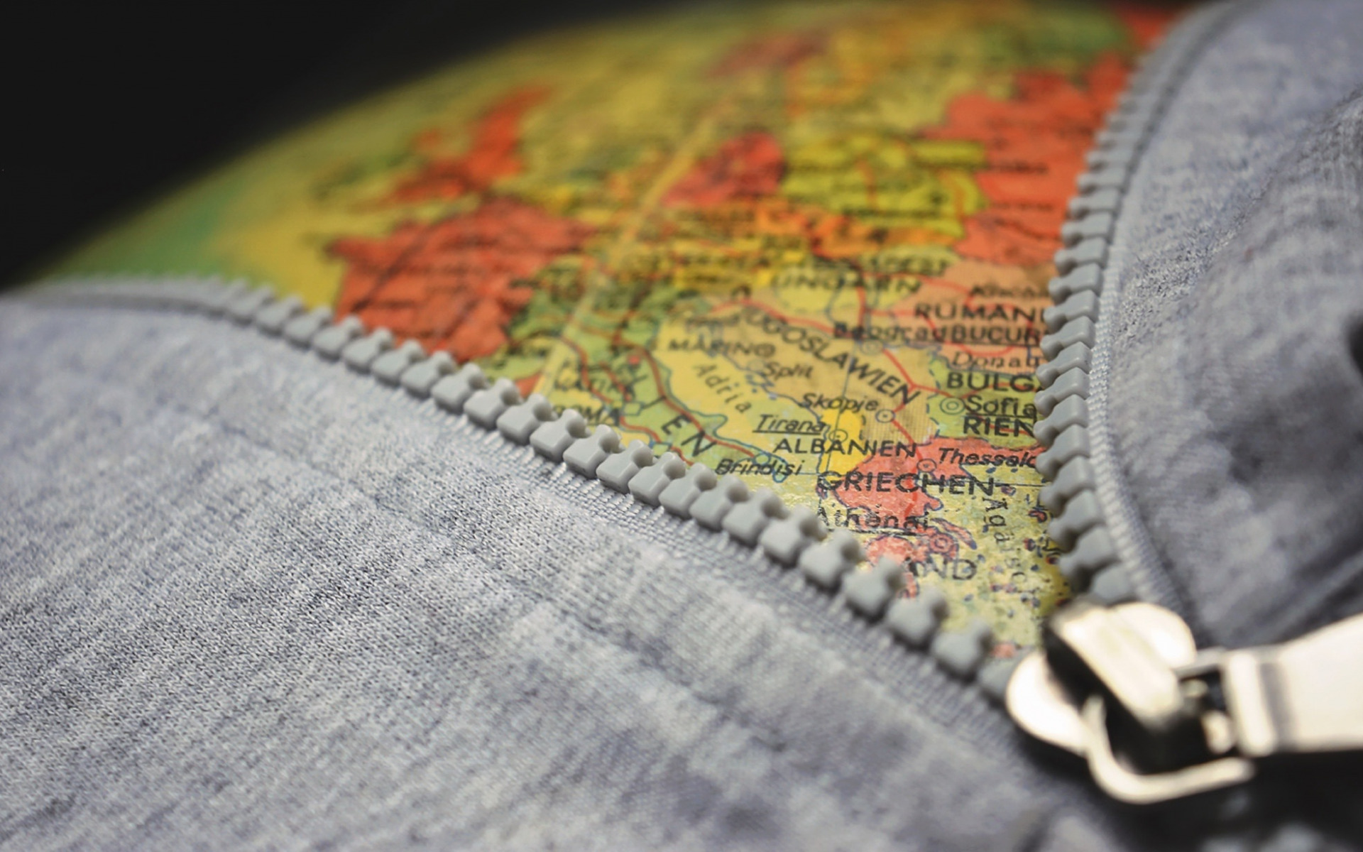 Description: A zipper is open on a backpack with a map on it's back pocket and a metal hook.