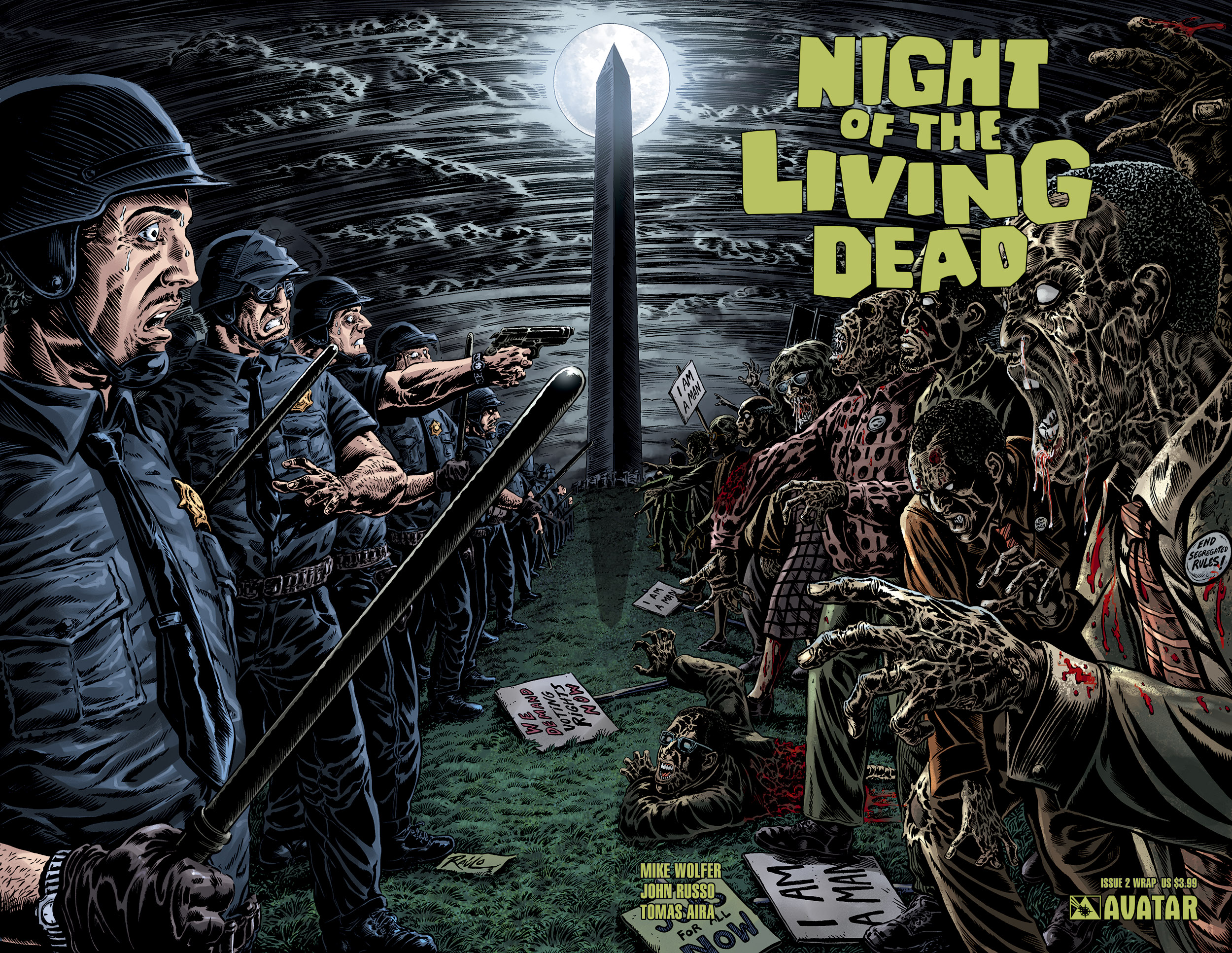 Description: A group of zombies standing in a line with a man holding a gun in the middle of the picture.